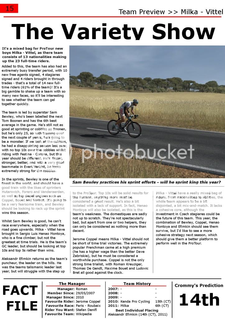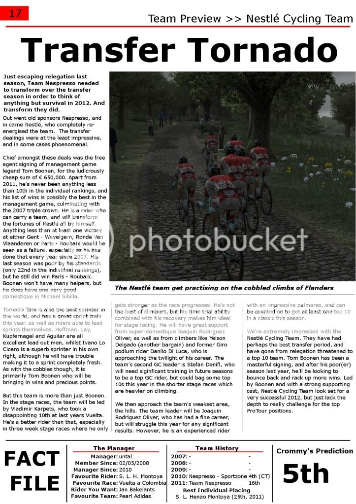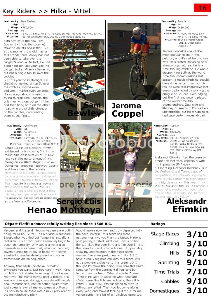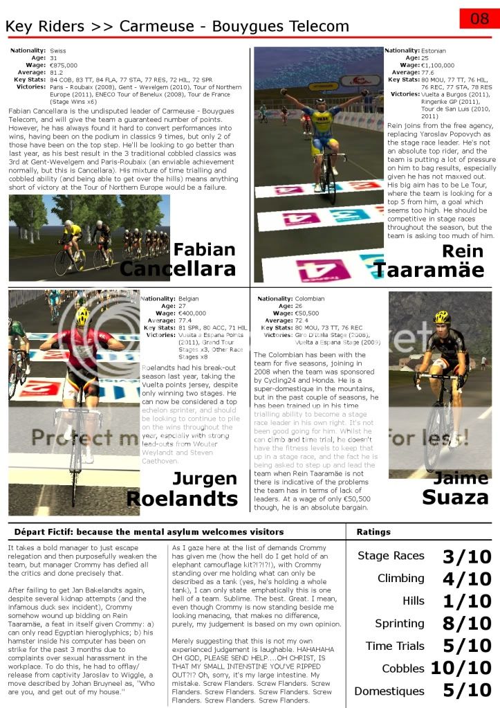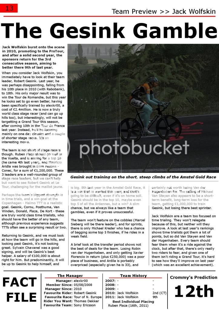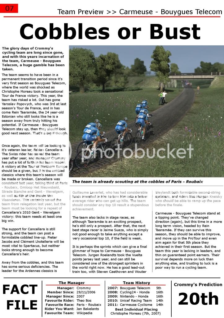 The thing is, with the rankings I found every team so evenly matched that I could have put most teams in any position, and it still would have been a reasonable prediction. I still think you might sneak into the top 5, especially if Gesink has the same season in the Ardennes as last year but slightly better due to the training, but it's still a gamble with Gesink. I hope it pays off though