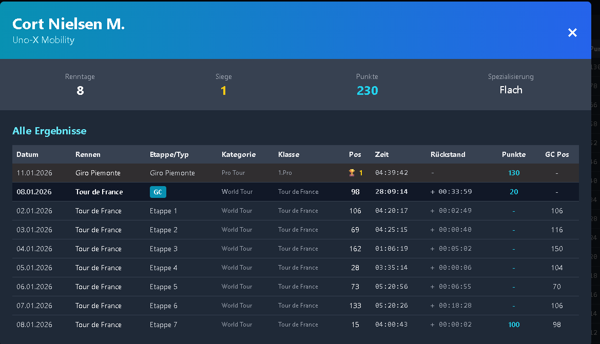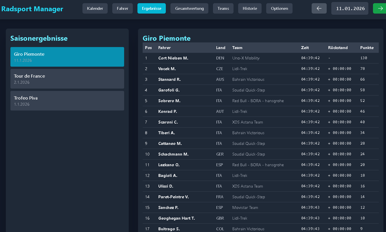 I am pretty happy with my rresults so far. Especially the draft system at the end of the year works quite good as well as contract renewals. Races work quite good, balancing is already quite ok. Calendar needs to be filled a little bit. But for testing the mechanics its not necessary to have much races. Here is a short Video of the general game.