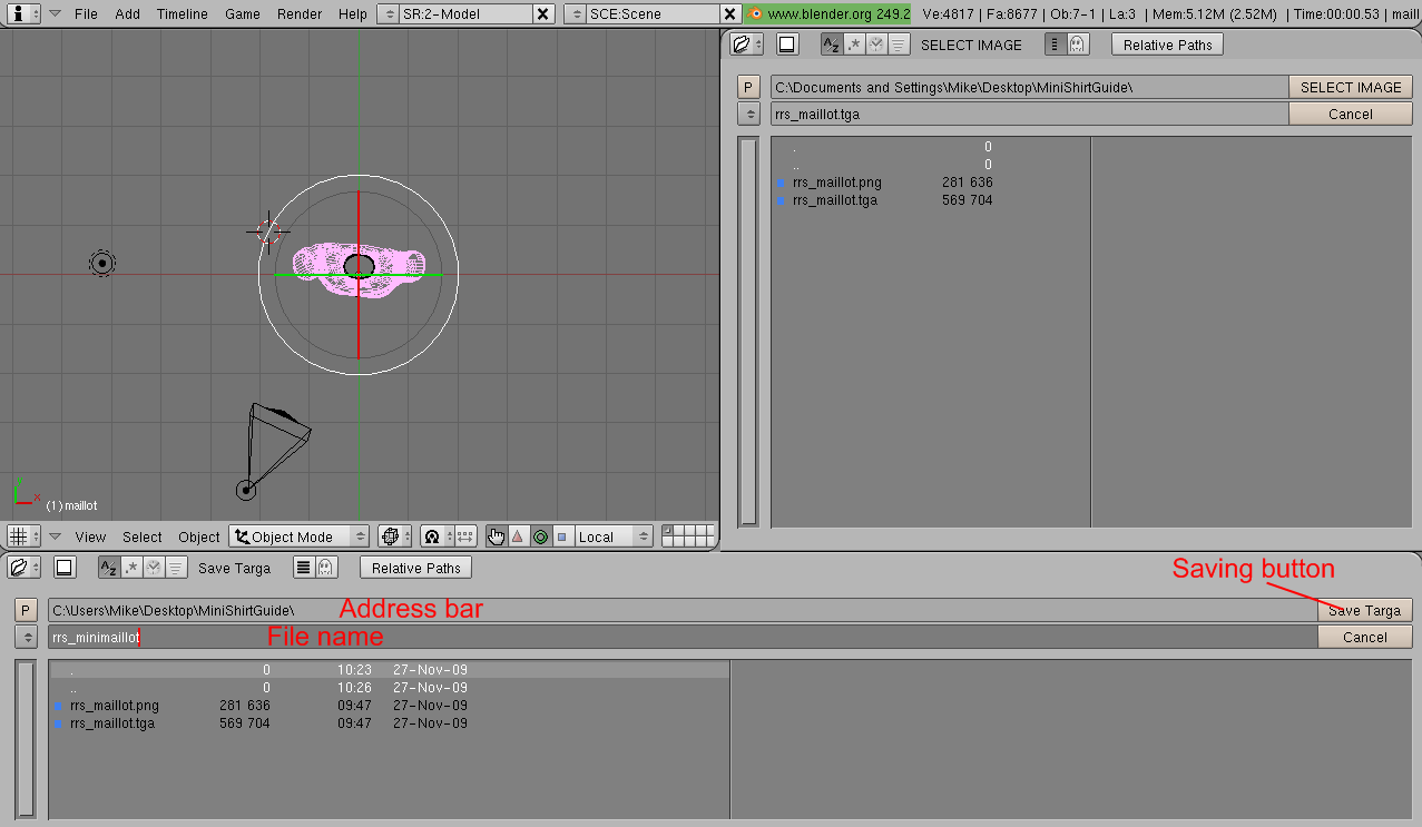 How to save the mini shirt Almost done. Click F12 - a window will pop up with an example of your mini shirt. In many cases, it will have a weird background colour, but don't worry about that. It can't be seen in-game. Return to the main window and click F3. This will open the saving menu. Choose where to save in the 1st bar and select a file name in the 2nd bar. When done, click "Save Targa".