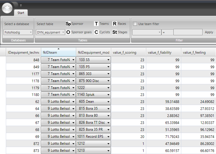 I can easily locate DYN_equipment_techno. But even tho i locate my current team in the save, and change fkIDequipment_model to the models i want, and save - and then launch the save, enter a race, i still have the old eq - giant, oval, sram.