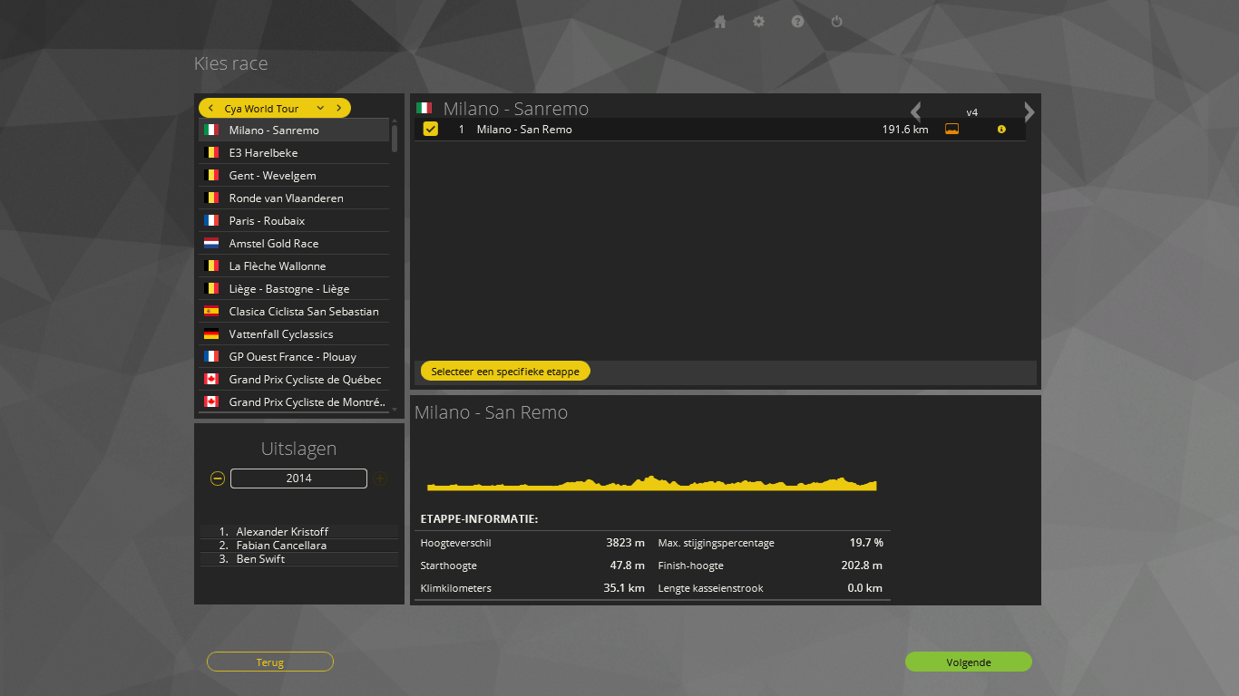 first one, variant of Milano-SanRemo, quite a bit shorter and without steep climbs, but with a lot more climbing km.
