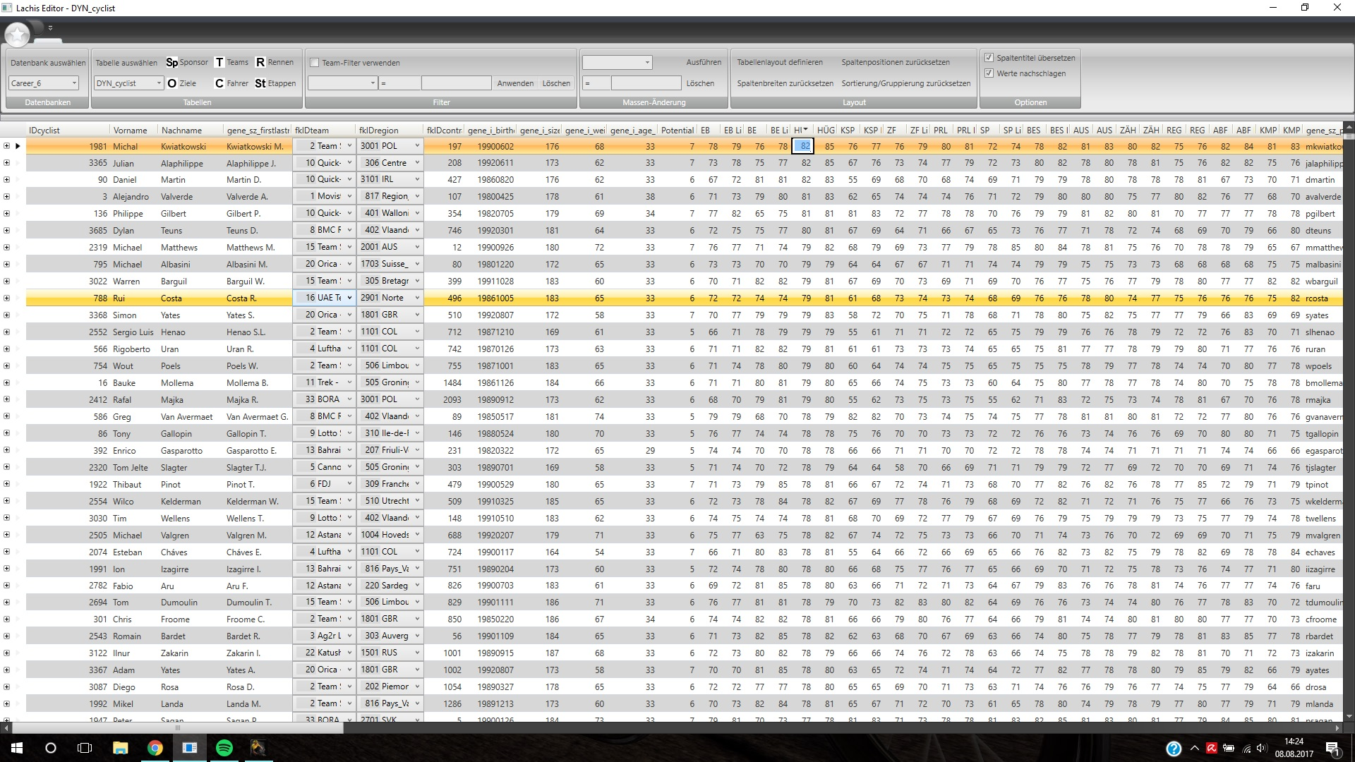 For example you can increase the age of decline for all riders by 2. Or you lower the sprint value for all Italian riders by 5%. Unlimited possibilities also means unlimited possibilities to mess so, so save before using this feature. You can also make a backup of the cdb file to be extra sure.