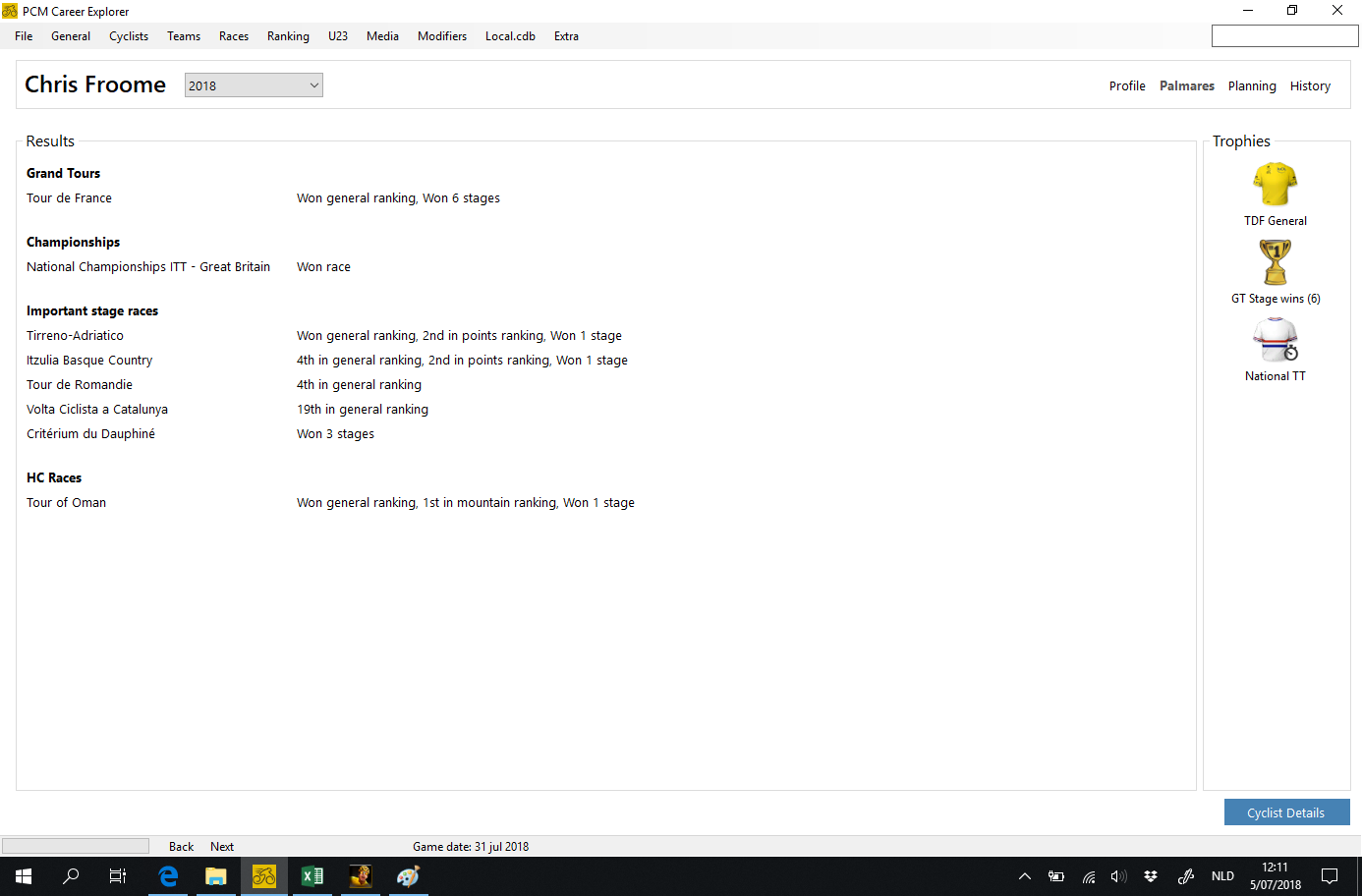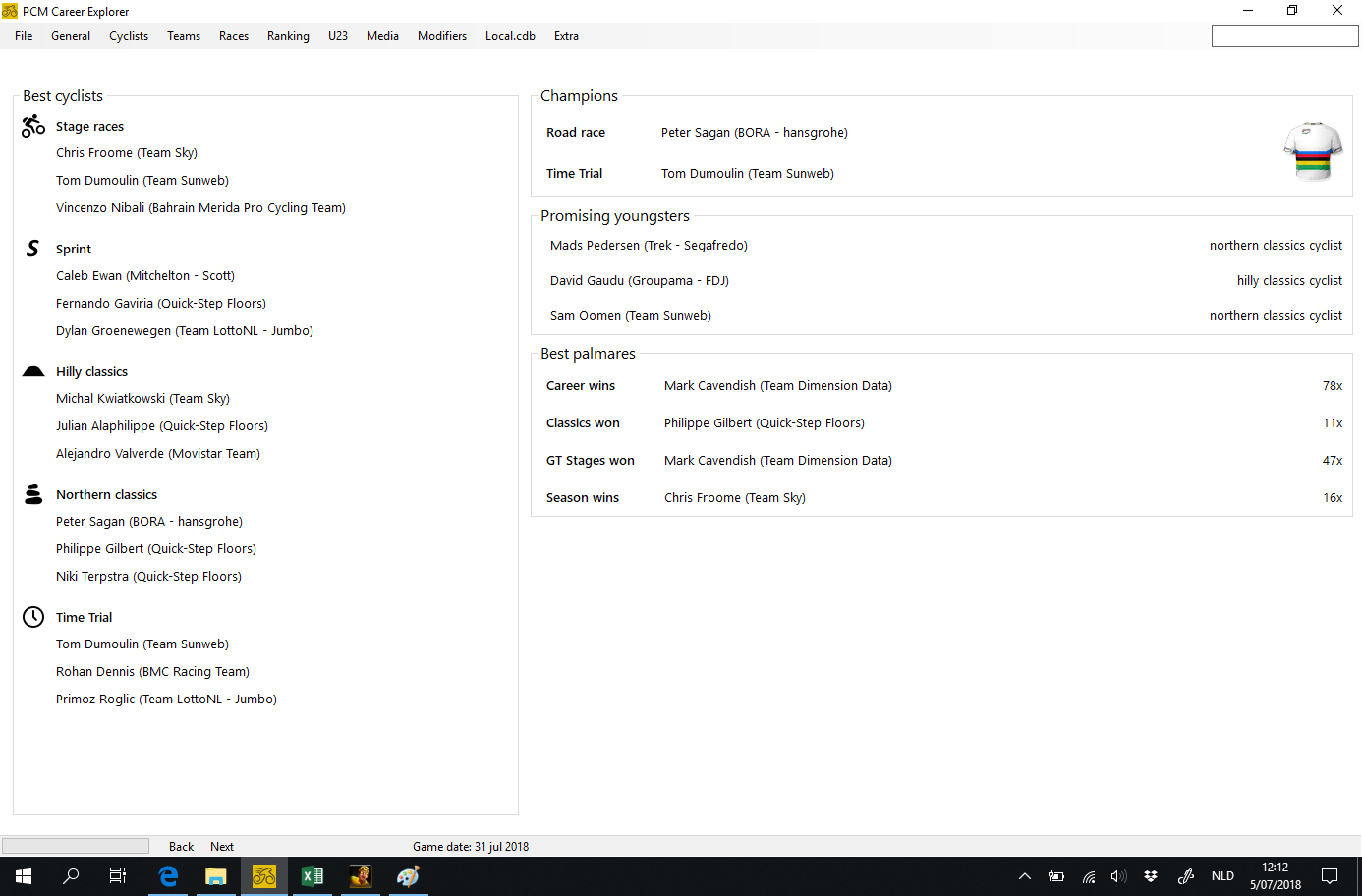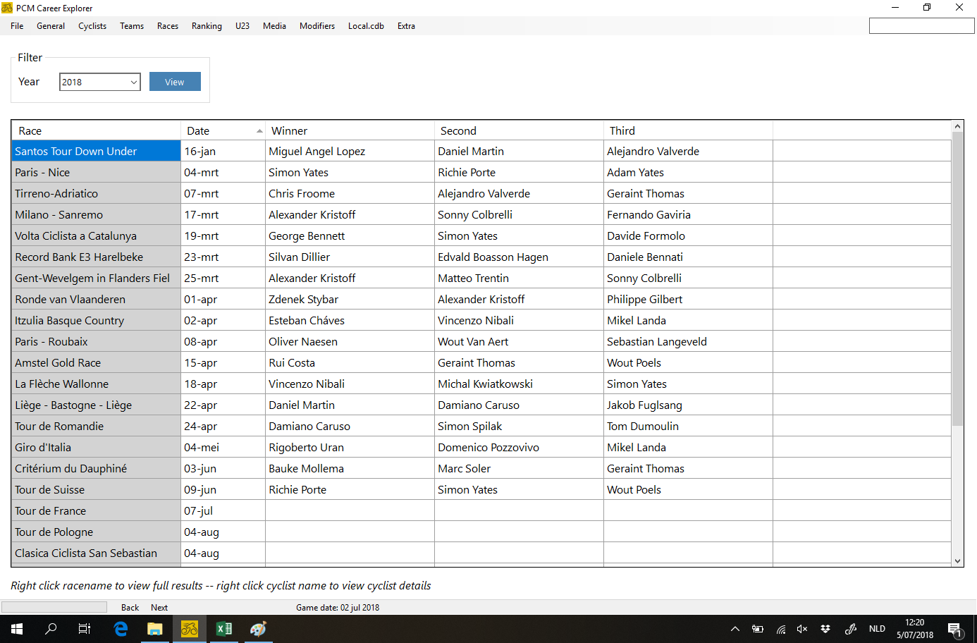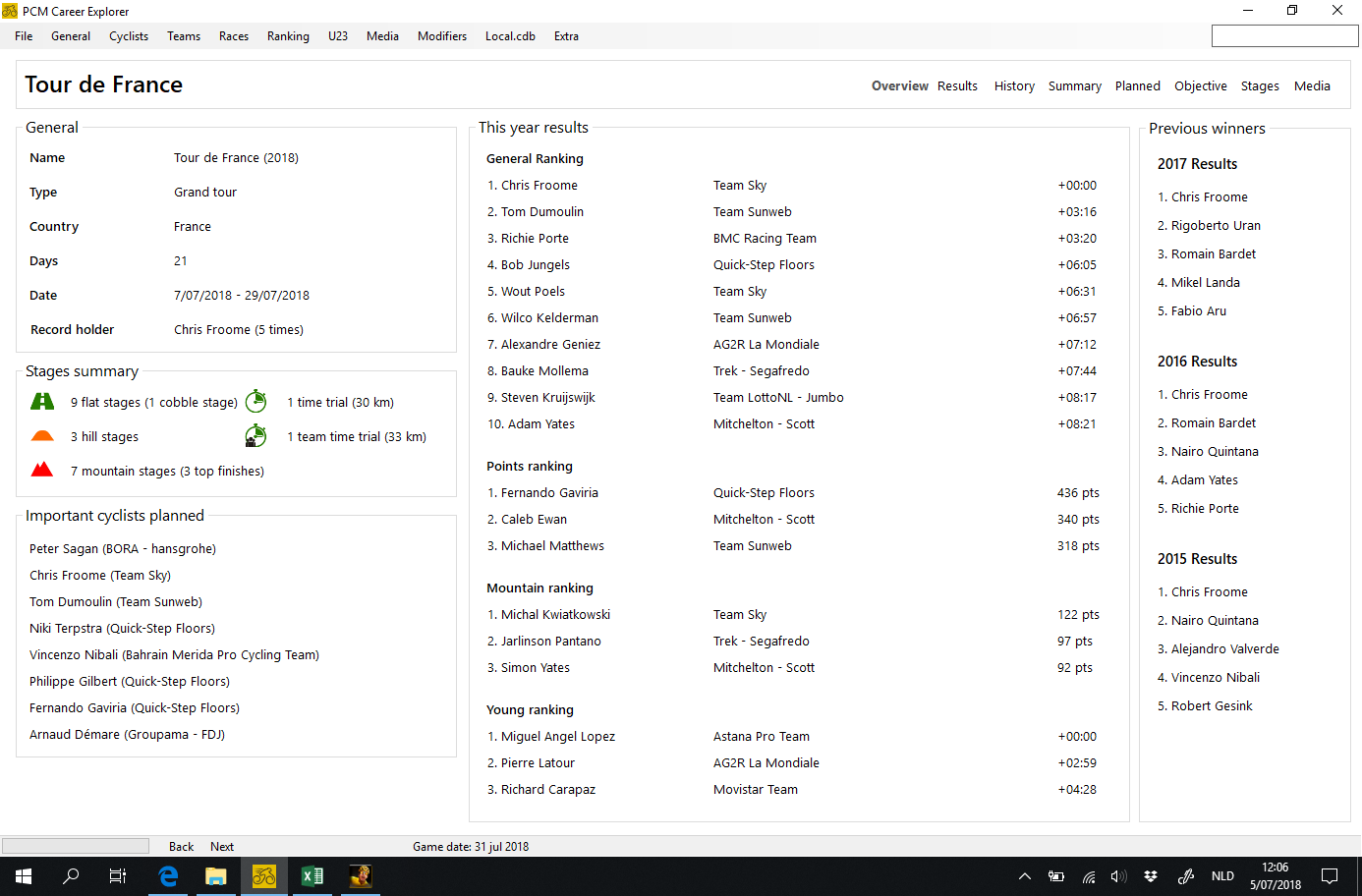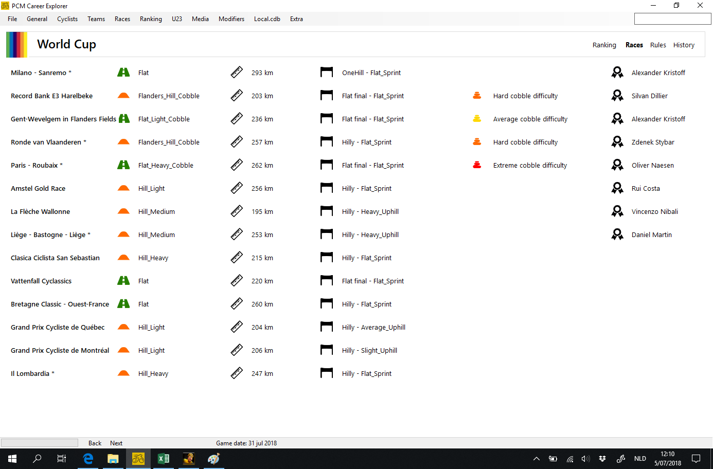 - Cycling manager throws away the detailed stage results about a month after the race is done, if you regulary open your savegame in PCM Explorer these results will not be lost because PCM Career explorer saves all the results in it's own database. So in october you will still see the results of individual giro stages, and the "Race Summary" screen will still work (show you who won each stage and who was the leader)