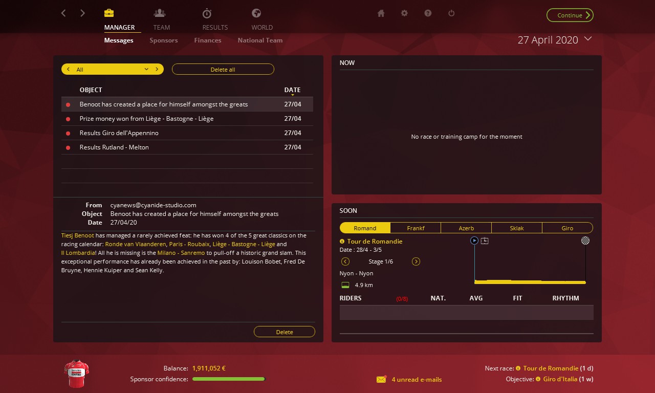 After a lot of succesfull years as a manager for my own team, where I had Pinot and Kelderman as the two stars. I have managed to get to season 2019/2020, where now Kelderman have won 4 Giro, and was leading for his 5th, but crashed on stage 21 and broke his hand.. So that pissed me off. Instead Majka took the win (also one of mine) ..