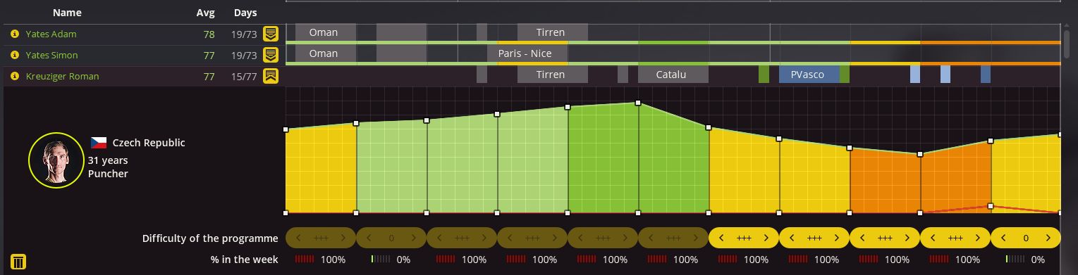 Alright, I have a question. After carefully planning my season with objectives and planner for the Yates brothers, I now see that they have a sudden drop in their condition, messing up their form for Paris-Nice and Tirreno-Adriatico (85% instead of 96%). They didn't ride anywhere outside of what was planned and when I check the training schedule, everything looks the same as I planned, except for this odd drop. Is this some kind of a drop that's being added by the game before reaching peak form? I noticed it for other riders too, like Ewan and Durbridge.