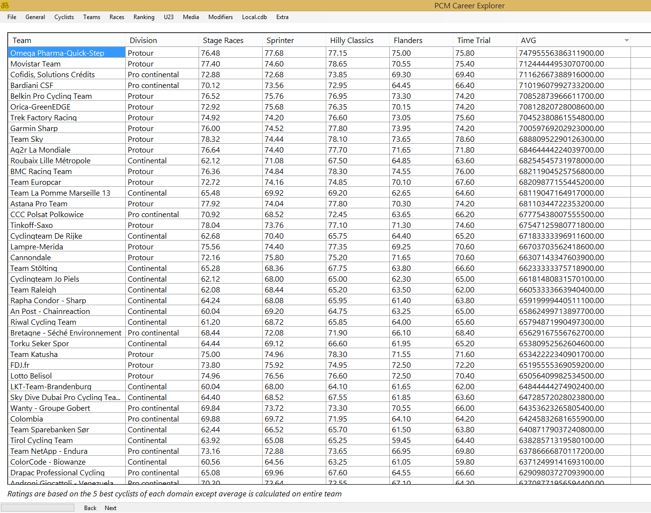 However, I noticed one thing (PCM 14): The AVG ratings in the team overview seem wrong. Fore example, I have a team with AVG ratings for my riders between 72.4 and 80.6 and yet the AVG column shows me 71.2. While the average ratings for each domain seem fine. It might be due to the AVG ratings in the roster screen also being a bit odd, with ratings either having 2 or 17 digits?