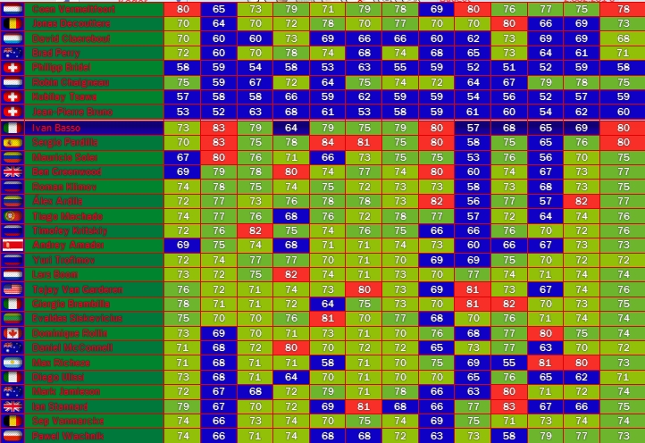 Notable others - Gesink and Crawford haven't got the TT skills to challenge for a GT I don't think (and Gesink's Recovery stat isn't high enough either), but they will be invaluable in helping the Leader - I'm planning for Crawford, Rogers and Popovych to ride the Tour and Gesink and Devine the Vuelta; Siutsou will help Devine in the Giro.