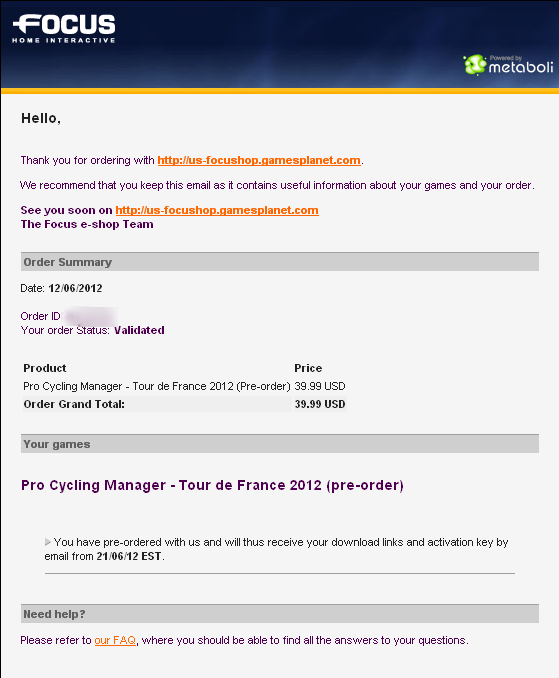 Your'll receive your download links and activation code by email the 20/06/2012 at 23:01 BST."