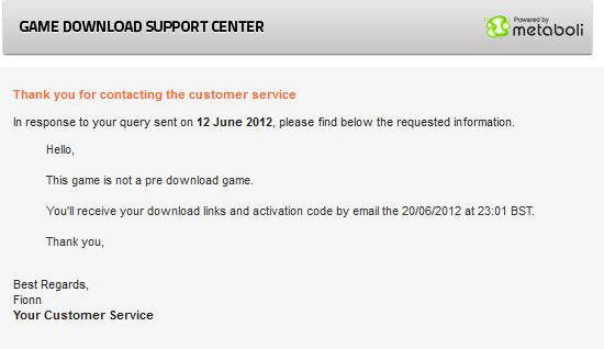 You have pre-ordered with us and will thus receive your download links and activation key by email from 06/21/2012 06:01 AM British Time.