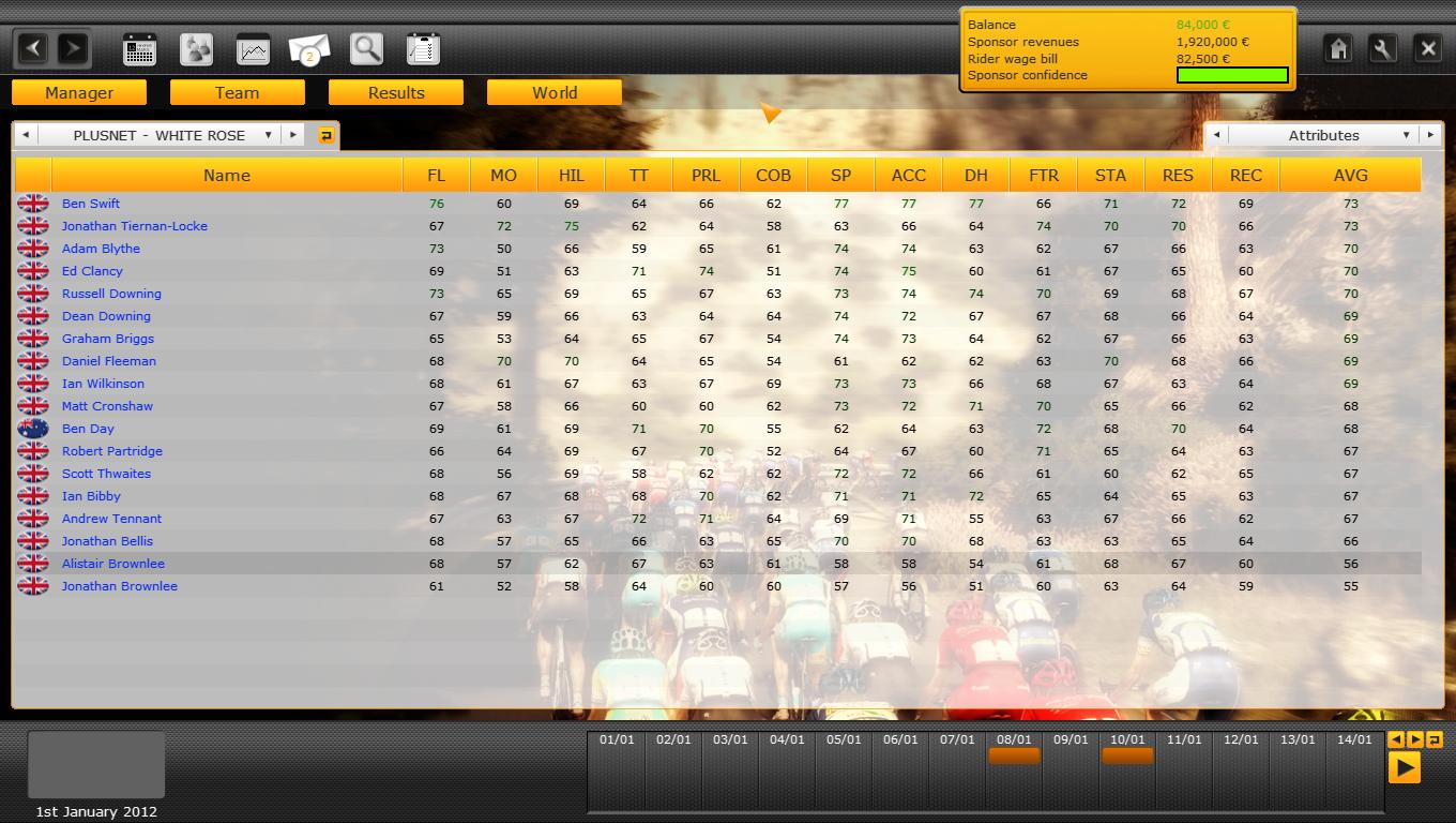 Plusnet - White Rose will be setup with a team balance of 20% as its a new squad, I've modified the sponsor model a little as I want more of the constant looking for a sponsor feeling of real cycling. The current sponsor could support a continental or Pro-Continental team, but couldn't support a Pro-tour team meaning I have to find a new sponsor to progress. As part of this I have modded the national level sponsors in the UK so they will accept part sponsorship.