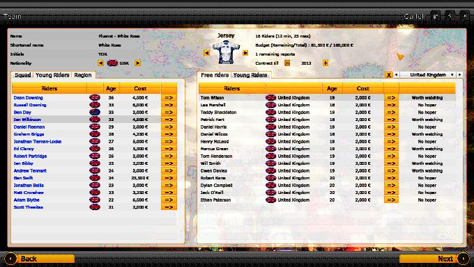 This is a British Team so will be run with full training. I will look to have 2 Doctors (with a budget of £10k between them), 1 Scout with a budget of £10k (Finding young riders will be important to us - we will have to assume the new British riders are in fact from Yorkshire, and will use this to keep the 50% Yorkshire/less blessed lands balance), I will want a ratio of 1 Coach to 8 Riders so will need 3 at the moment. 1xSprinter, 1xTT and 1 Puncher/Stage Races. Max Budget for them, £10k each.