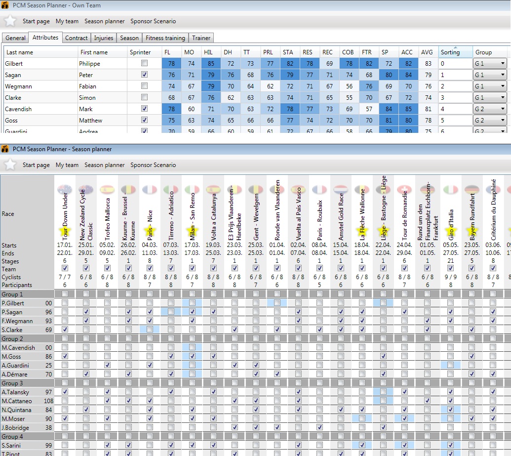 I do see another problem though with riders being scheduled for Catalunya, but also for E3 and Wevelgem. This is not possible. Same issue with Eurometropole and Lombardia, so better check out those race dates first... |
