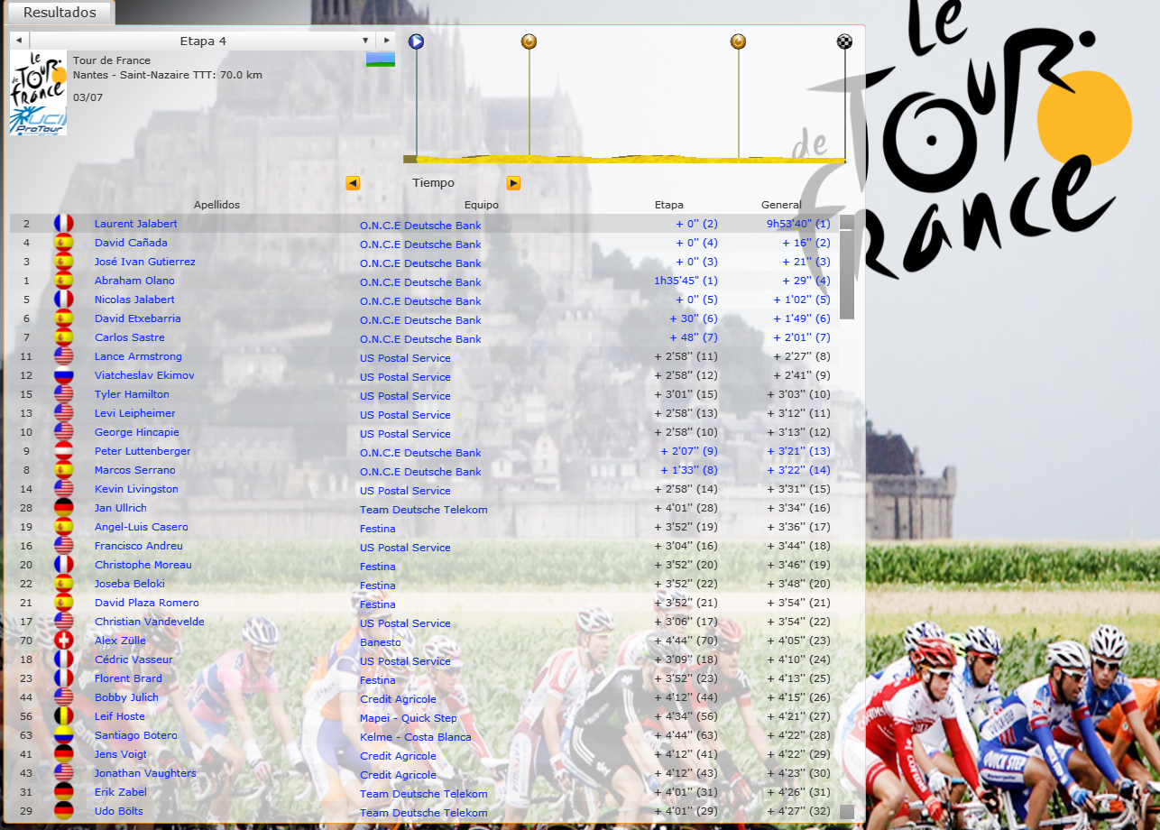 OMG What a day for my team!!! Today i have the Maillot Jaune with Jalabert..And the most important thing.. I Catch many time..Now Armstrong is a 2´27",Ullrich 3´24", Beloki 3´48",and Zulle at 4´05"..Many others rivals like Escartin, Heras, Pantani or Virenque lost a lot of time for the general .. Here is the new general classification stage after St Nazaire Tomorrow stage 5