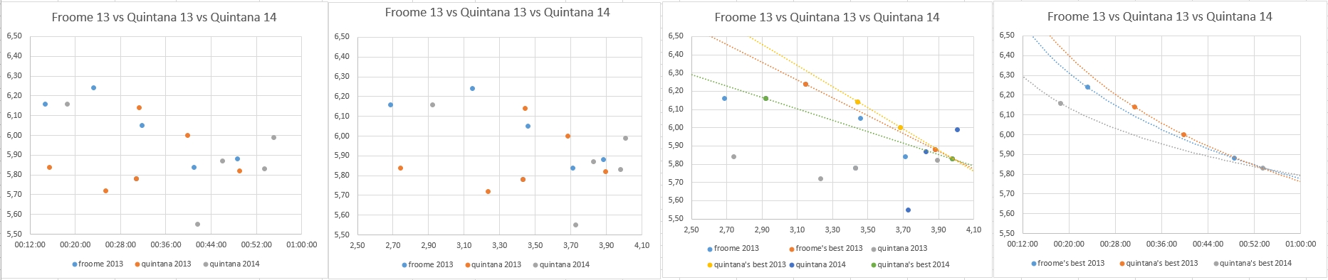 3) sorry for the colours that have changed... I have isolated the best performances, and drew a line that's supposed to show their best potential performances. I deliberately left Quintana's Giro TT out (far right grey dot), as it wasn't really at the end of a normal stage.