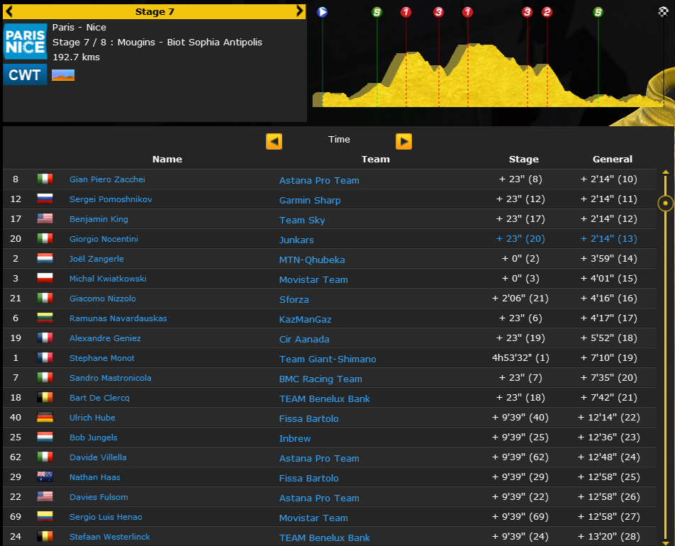The extreme example is the cobblestone stage. I didn't catch it immediately, but I believe around 25, 30 km to go it was still a large peloton and then the acceleration happened at the front with Sagan and Terpstra especially. Those got clear of the rest of the field and won by about 5 minutes against a group of 27 riders. And that group included a number of favorites, my guys (Kwiatkowski and Kreuziger), Valverde and Contador. But my pure climbers Aru and Pinot missed the cut and I saw their heart rate had dropped to 120, so nothing was happening in the peloton anymore. Just for the sake of it I let both of them attack in the last 10 km and relay together at 80 effort and even they won over 3 minutes on Froome and Co.
