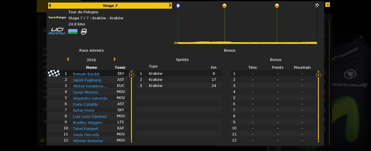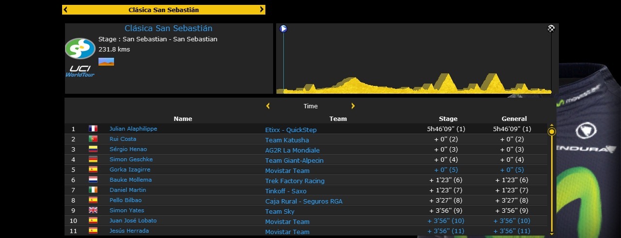 A low key affair, with most of the high profile riders absent from this race. What was billed to be a tussle between Kwiatkowski, Valverde and Richie Porte, threw up a somewhat surprise winner. Romain Bardet took his chances well going up the mountains and impressed with a couple of stage wins. He seemed to re-capture the form he had at the end of the Giro. A good performance in the last stage ITT catapulted Javier Moreno above Valverde and into 4th place, making him Movistar's best finisher. Valverde finished 5th with Luis Leon Sanchez 8th, handing three more top 10 finishes to Movistar.