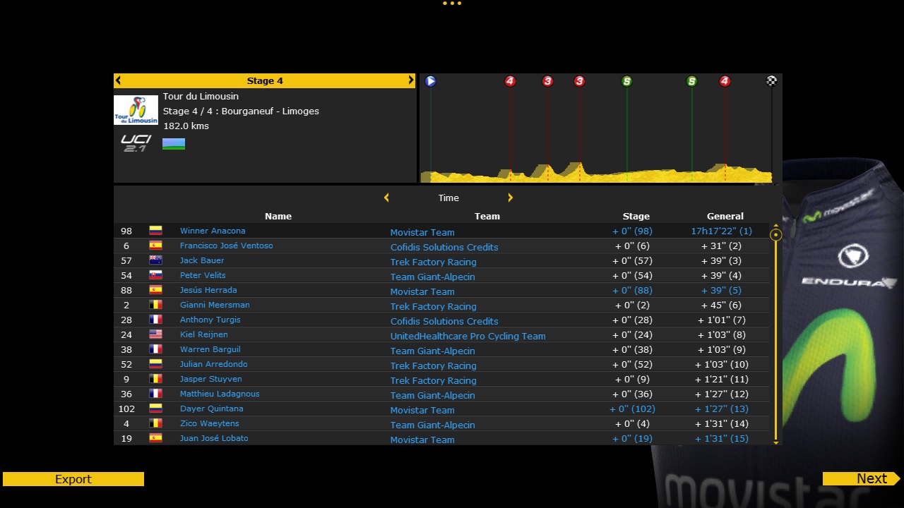 The highlight of the end-season was the fantastic solo breakaway win in the Il Lombardia for Alejandro Valverde. The first Monuments win for Movistar with me as manager, and it had to be Valverde to do the honours. He also won the Memorial Marco Pantani with Ion Izagirre completing a Movistar 1-2. The Chrono des Nations was the last race on the calender. It was almost like the UCI's way of saying, "Go on, we know you have the best time trial team. Win this one to finish off the season on a high note." Adriano Malori duly obliged.