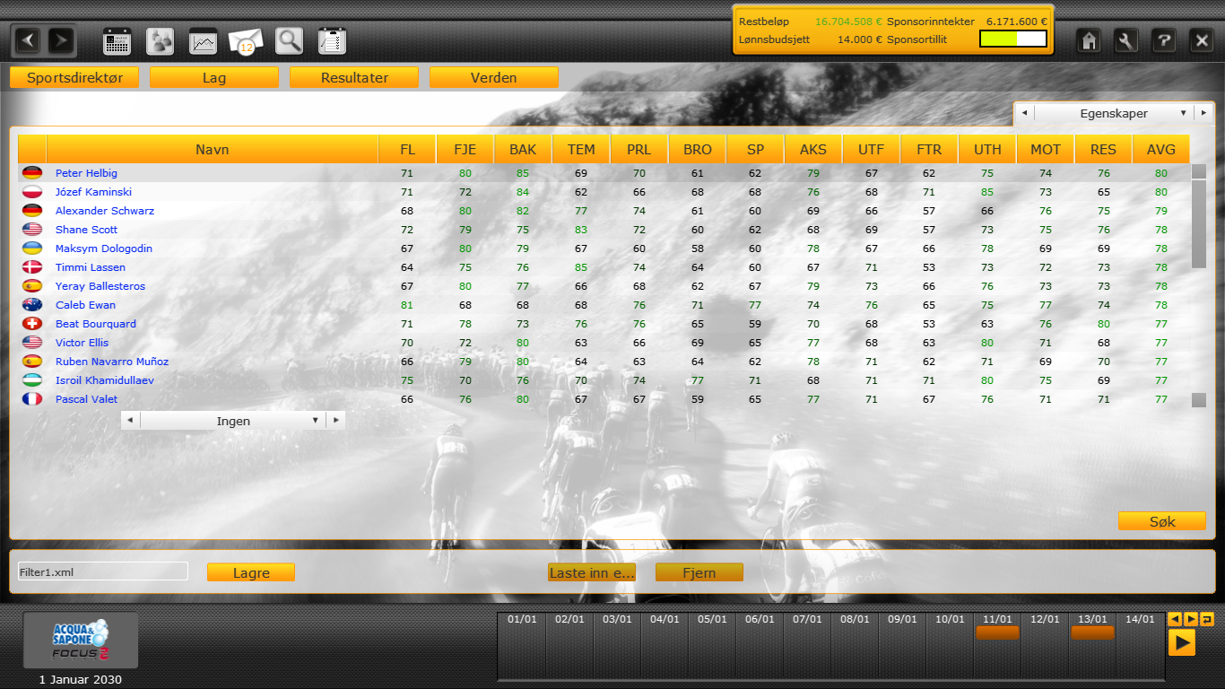 Here's the list of the best riders as of January 1st, 2030. Kaminski and Helbig are the best hill-riders at the moment, by far. Thankfully, they're quite young, both 26 I think.