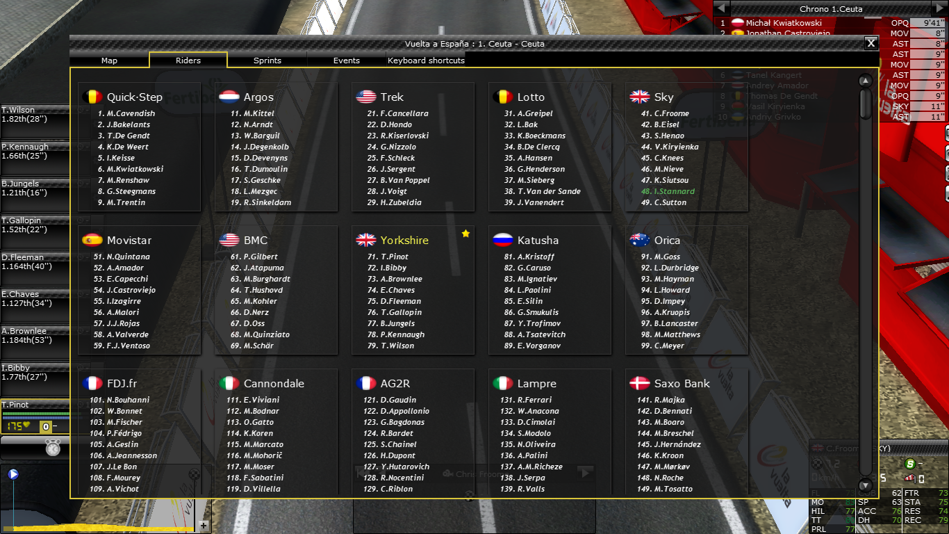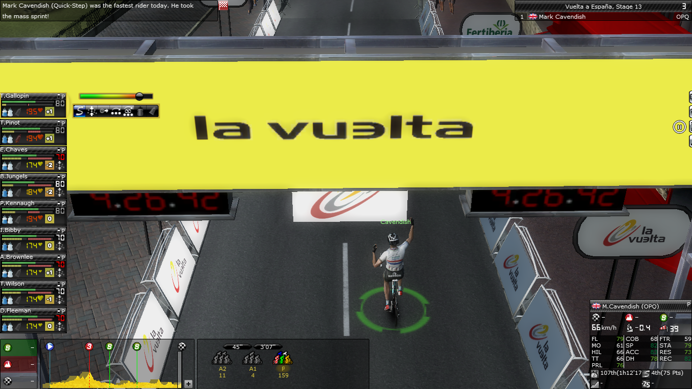 The career went abit weird. The Vuelta was too easy, I had the only tema that turned up with a GC rider. I presume this is a fault, so therefore I am going to re ride the Vuelta. The tour of Britain was the same so will redo that as well.