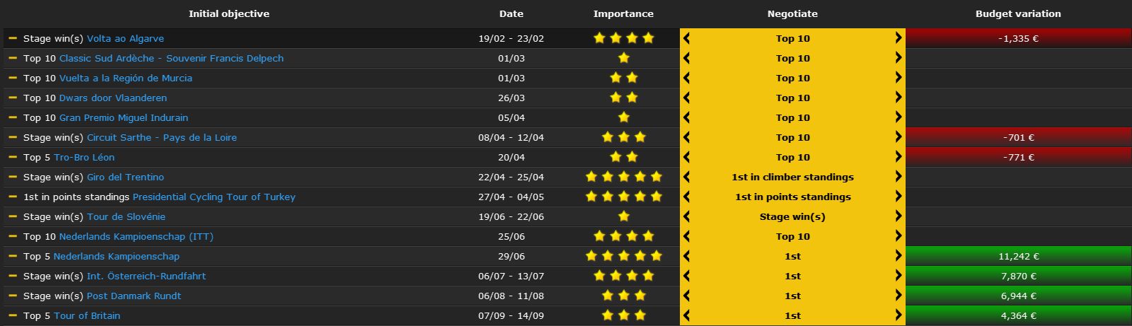 The cunning plan (or cynical exploit if you prefer) is to make sponsor objectives before July easy, to get good sponsor confidence, and set all sponsor objectives July onwards to 1st to generate a large rider budget. Sign a 1 year sponsor deal in July on the back of achieving easy objectives and after that your results don't matter for sponsorship, only for promotion.