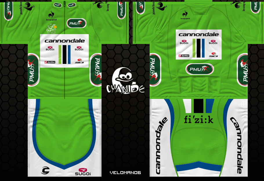 Could someone give me the leader's jersey of the mountain TdF for Cannondale in the same style as this one but with red dots on the shorts rather than solid red ? Thank you to whoever does this to me
