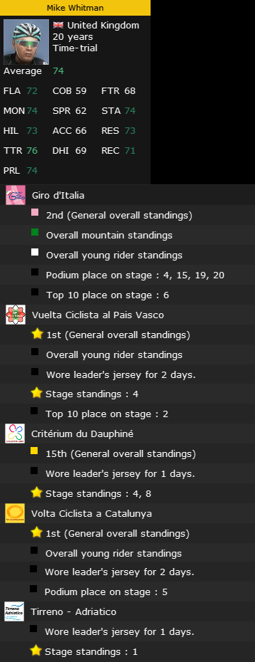 In the second season he's asked to assist his leaders in all stage races from Tirenno-Adriatico to the Dauphine. The game awarded him his first professional win by crossing the line first in the opening team time trial of Tirenno-Adriatico and thus also the leader's jersey, though he lost it only a day later and worked for the team for the rest of the race.