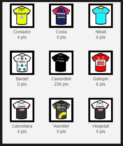 | Nairo Quintana | Movistar Team | 22 | | Peter Sagan | Tinkoff | 20 | | Ilnur Zakarin | Team Katusha | 12 | | Daniel Martin | Etixx - Quick Step | 12 | | Adam Yates | Orica GreenEDGE | 10 | | Thomas Voeckler | Direct Energie | 8 | | Chris Anker Sørensen | Fortuneo - Vital Concept | 6 | | Vasil Kiryienka | Team Sky | 6 | | Adam Hansen | Lotto Soudal | 4 |