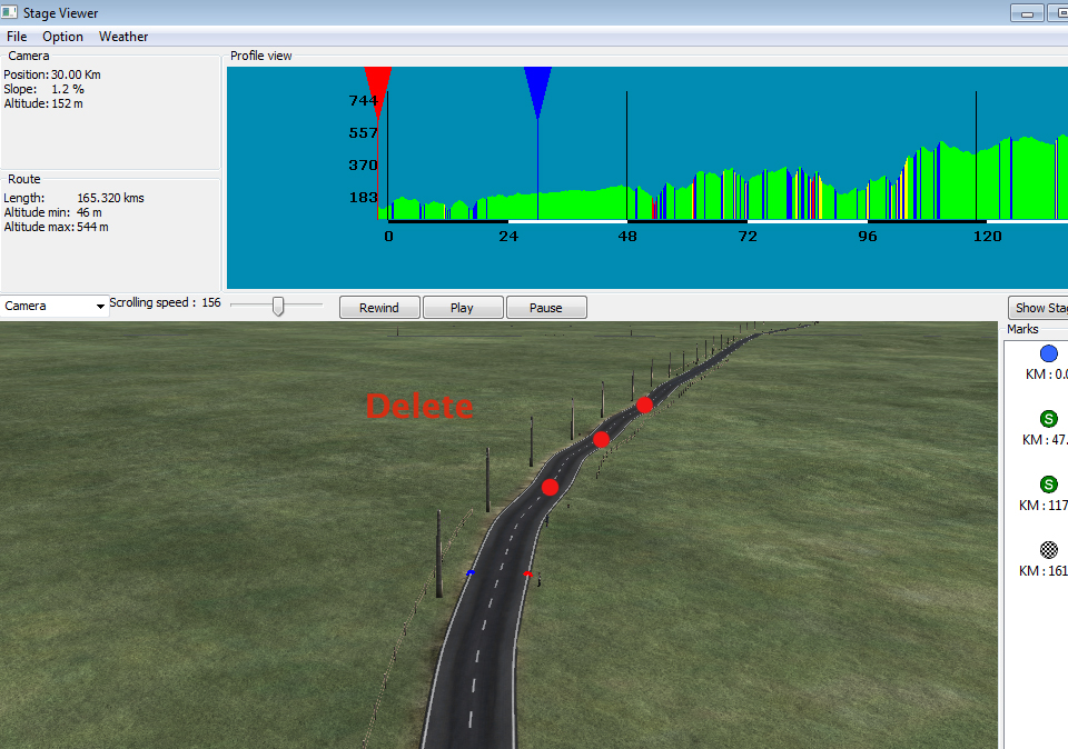 - First, in some parts you have too much points. Besides already having increased your work, this makes the road less smooth and the gradient less constant (I find the gradient important even in flat stages - it's bad when it goes from 2% to -1% back to 3% to -2% and etc). Take a look in the attached pic, if you delete those road points the curl would look much smoother plus the gradient would be better. But don't overdelete, sometimes it can look quite bad.