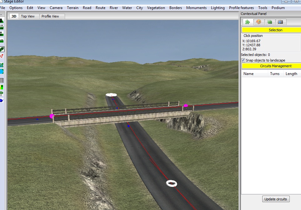- Then there is the -14%/12% descent/hill at about 53 kms. That's quite unrealistic. There is an easy way to fix it: that part of the landscape looks perfect for a road passing above another. So just delete the road point that is bringing the road down, create a bridge there and add another road below.