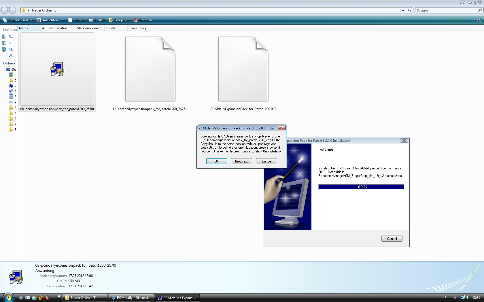 So I put the three files into a new folder, but it doesnt work. After the program wants the second file (Screenshot ) I clicked on Browse to select it manually. But then only the second and not the third file were shown. So I select the second file and the installation process goes on till the program wants the third file. Again I clicked on browse to select the file manually, but the file wasnt there, but its obvious that the third file is in the folder.