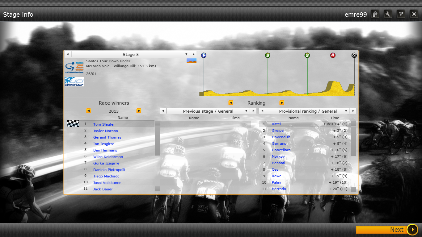 The queen stage of Tour down Under which will select the GC winner also! We will past the Old Willunga hill twice and finish on the top of it! The persentages are very high (%10+).