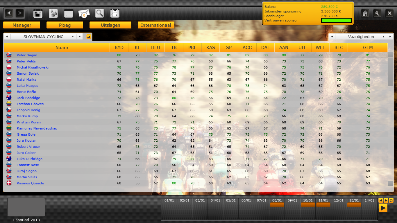 Stage win at Tirreno, Top 5 at MSR, Gent and E3, Top 10 at RvV and Roubaix should be more than possible. Unfortunately with Nizzolo's signing Lampre wants me to win the points jersey at the Giro, so that will be... difficult (especially considering the Sky Sprinttrain - hope not too many high calibers will ride the Giro). Stage wins at Tour de France and Top 5 at Vuelta are definitely within reach, with the latter being the big season goal by Caroli.