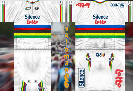 Rainbow stripes according to the following order: blue, red, black, yellow, green (refer to UCI graphic rules, p. 16).