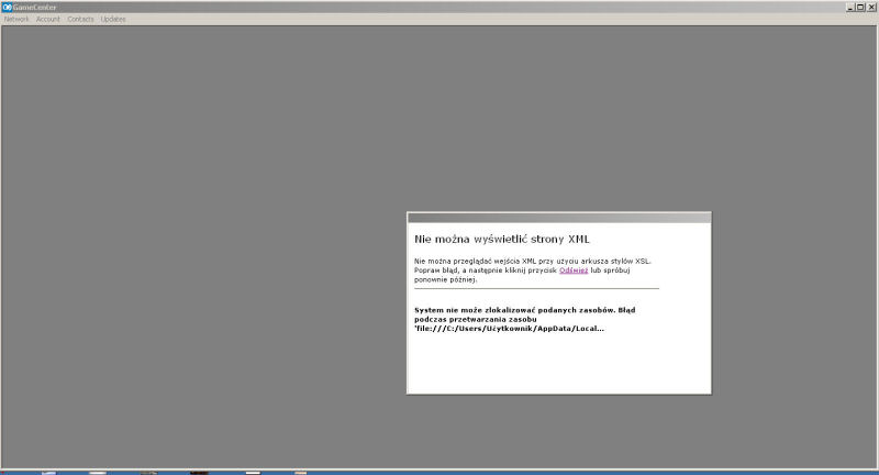 this is path to file with login form and GameCenter I suppose can't read "Uzytkownik where z=z+dot above letter z" within it (it means User, typical path to default user of Windows folder) so it can't find login form, stylesheet xls files, html files and gives only error