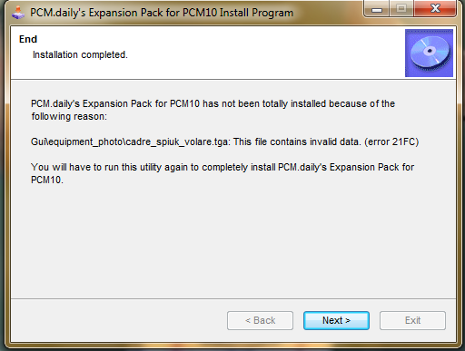 PCM.daily's Expansion Pack for PCM10 has not been totally installed because of the following reason: