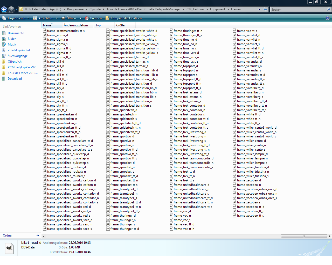 I created a new frame and copied it into the equipment folder, replacing the Contador-frame. When i tried to check it ingame, all my riders rode on the Contador-frame. After closed the game, I opened the .DDS file again and it showed the new, self-created frame