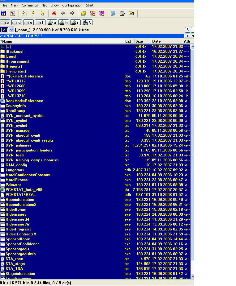 -- Jpgs folder holds all the GUI graphics (flags, minishirts, riderpics and some other files used for the excel userfors(so don't empty this directory, just add you GUI DDS(converted to jpgs) if necessary). In the sub-folders (general graphics in general, charts and date related in a sub-folder for each year you play) you'll find your graphics as created/referenced by the PCMSTAT tool.