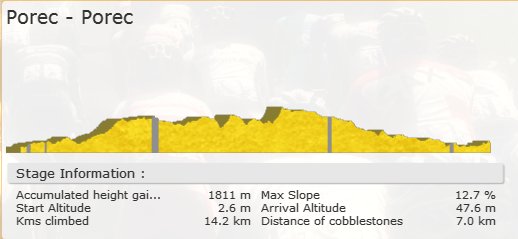 Trofeo Porec (Croatia) one of the most popular races in the 1.2 calender, Made aa new and better version of this,has cobble and some minnow roads. For reasons I don't understand the editor has declared this a flat race and that is not the case.But who am I to question Cyanide's wisdom..
