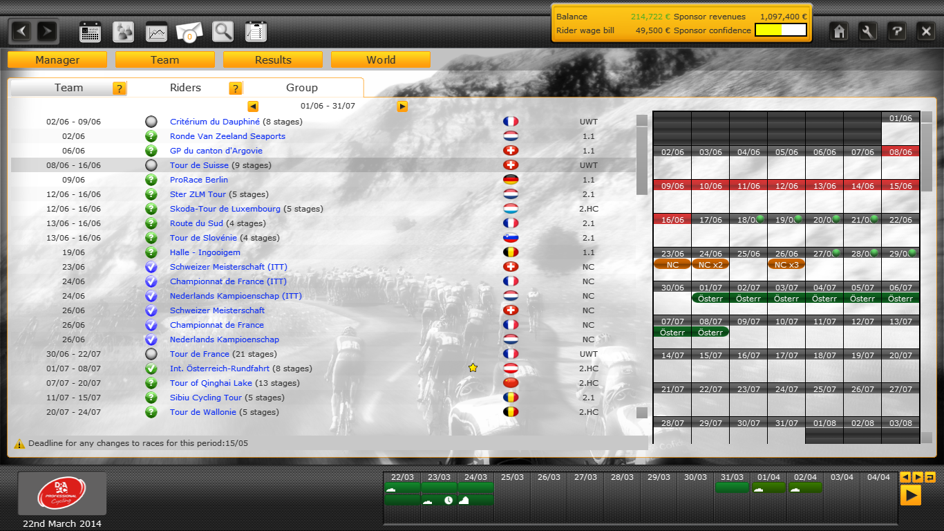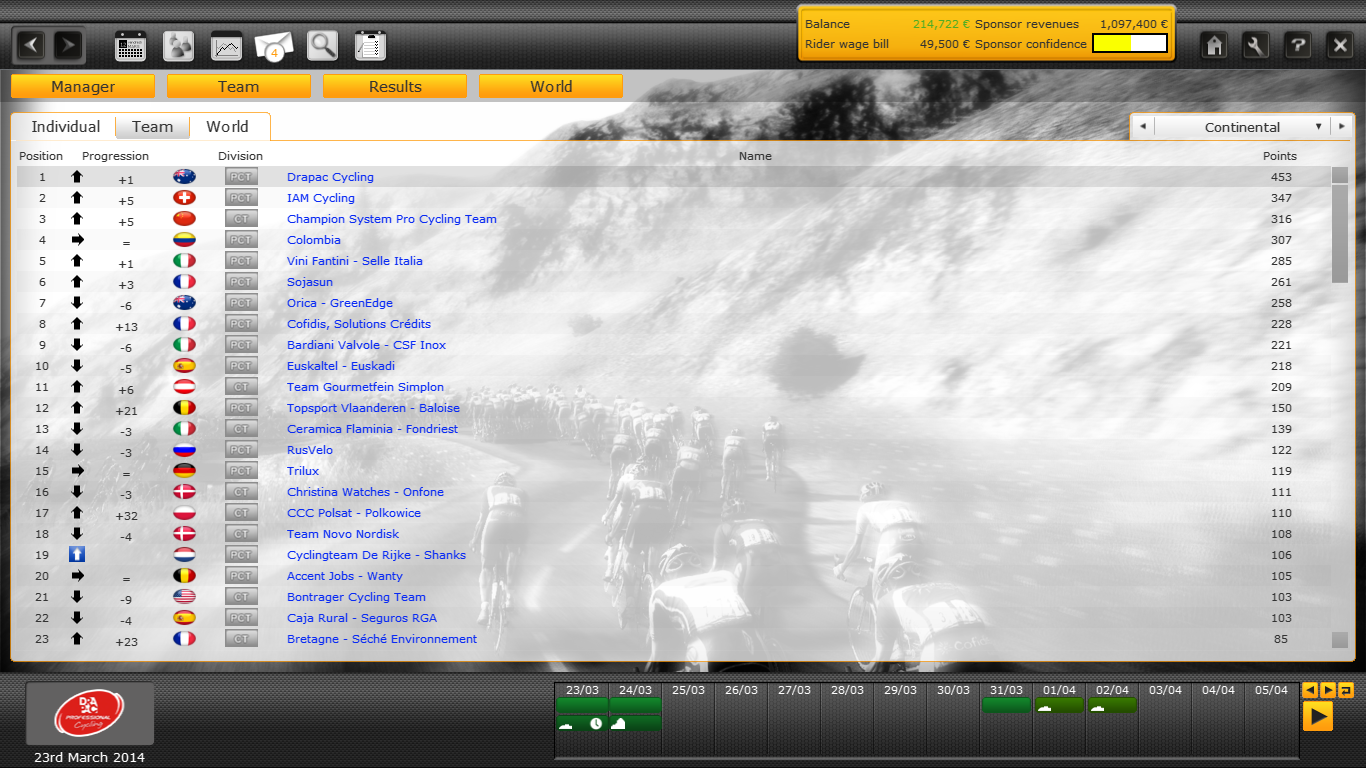 My team got promoted to PCT. I've been given a race schedule, but it's a bit thin on the ground - fewer races than the previous year. I'm not attempting to get into UCI WT races - only 2:1 and 2:2 around Europe. In the previous year I got some of the requests for an invite accepted, this year none at all.