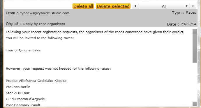 Of those races, only Tour of Qinghai Lake replied with a yes (screenshot 2) - which based on the previous experiment I wasn't expecting. It also happens to be a race I'm not interested in (clashes with a sponsor requirement).