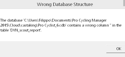 Hi everyone! I have a serious problem: every time I try to load my pro cyclist career, an error pop up shows up telling me there is a problem with the DB. What shall I do?Playing on Exp pack v 0.8. Thanks a lot.