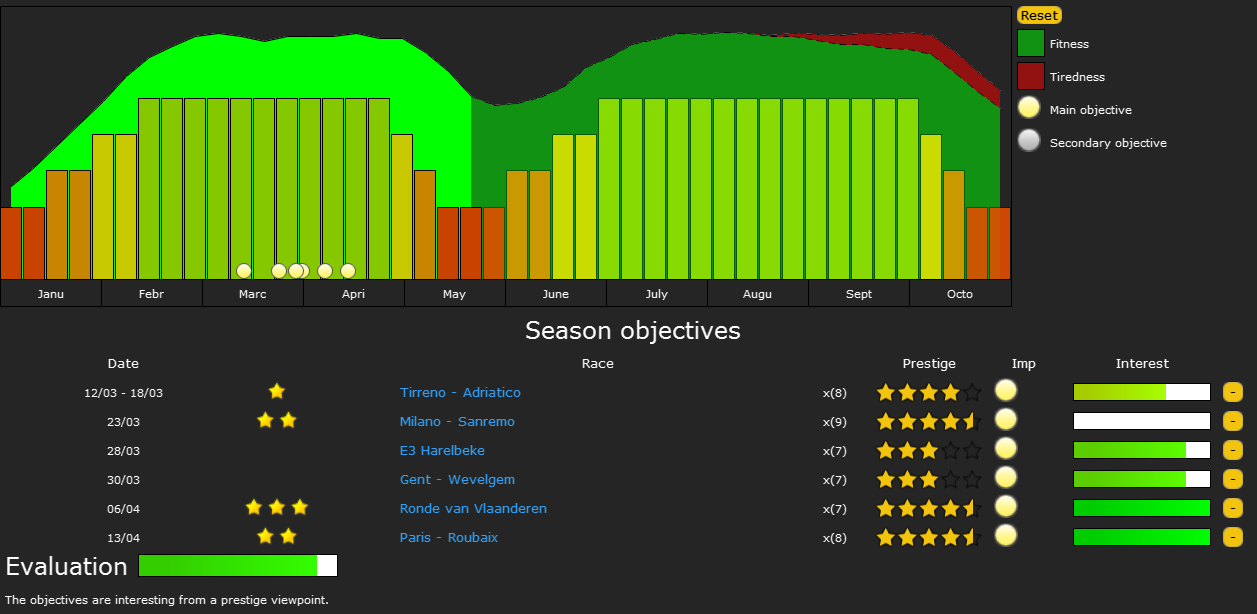 For example, it would be a mistake to set only LBL as an objective for your Ardennes specialists, freshness will be bad for Amstel Gold and the Fleche Wallone. But it'd be fine to only set Amstel Gold as an objective - as long as you have no more objectives that season or the next one is, say, San Sebastian, months away, freshness will be excellent for all three Ardennes races. Doesn't make much sense, but it works. |