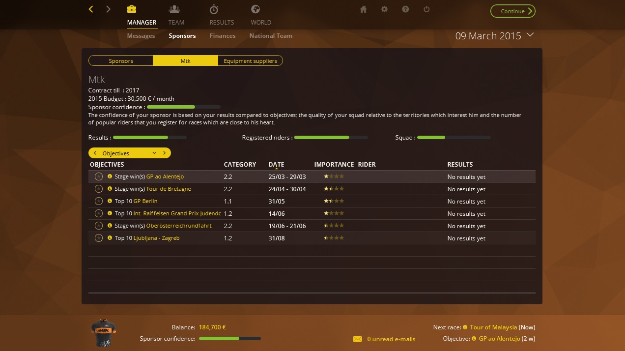 Lastly, is there an overview available for the sponsor goals per World Tour Team? I'd love to see them upfront before choosing my team career.