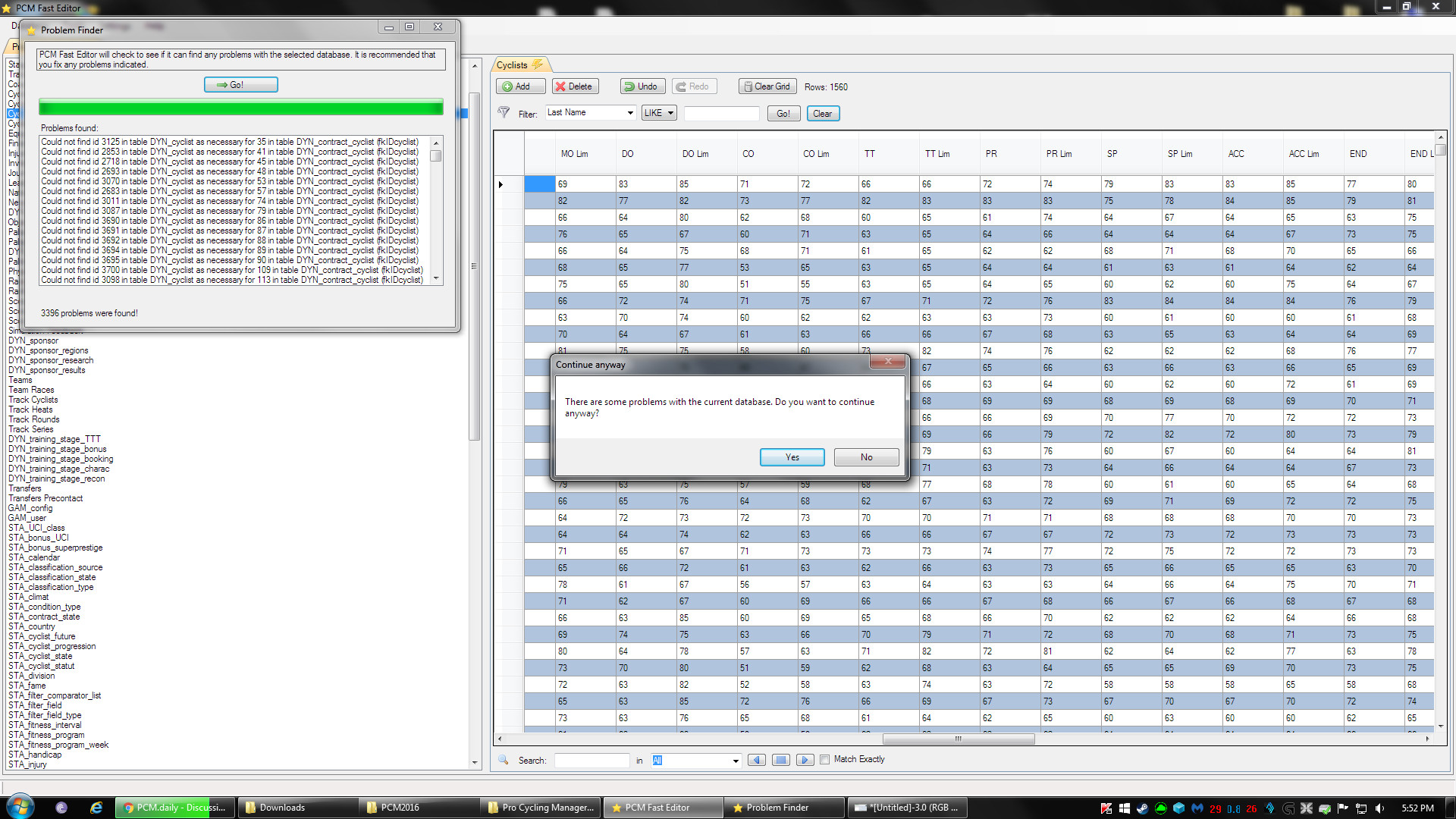 I've used the PCM Fast Editor on both PCM 2015 and 2016 now, both using Pro Cyclist Mode, and I get a message about missing information when trying to save the DB. It didn't seem to create any problems, i was able to play to lvl 26 in 2015 without any ill effects (at least to my knowledge).