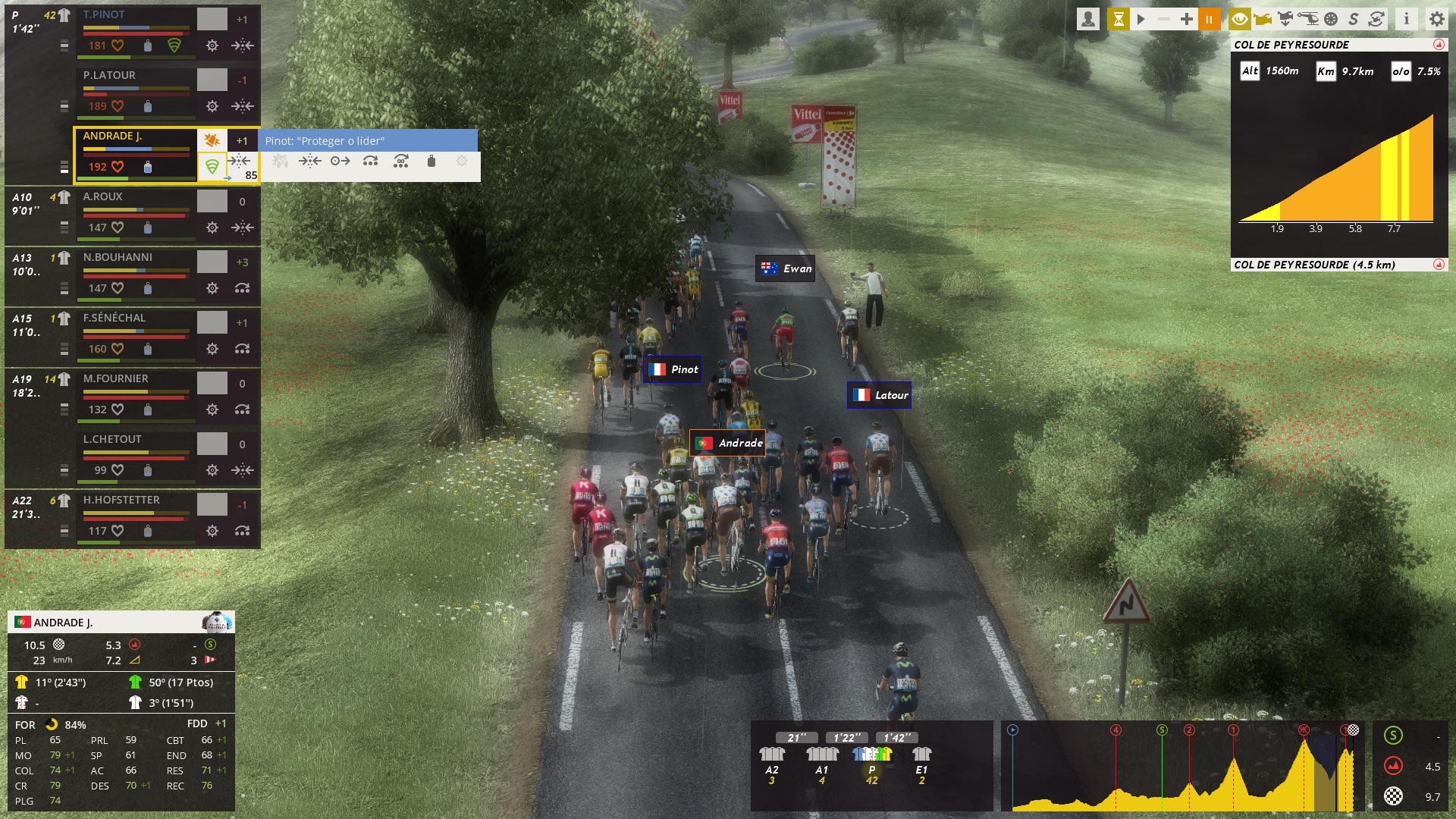 I'm in AG2R and I'm a stage race rider and my leaders are Pinot and Latour. We are finishing this stage and as you can see Caleb Ewan is still in the group after a HC, a 1, 2 and 4 category climb. Myself, Pinot and Latour are at the max. with our HR at 190 and we have 79 or + mountain and with FDD +1.