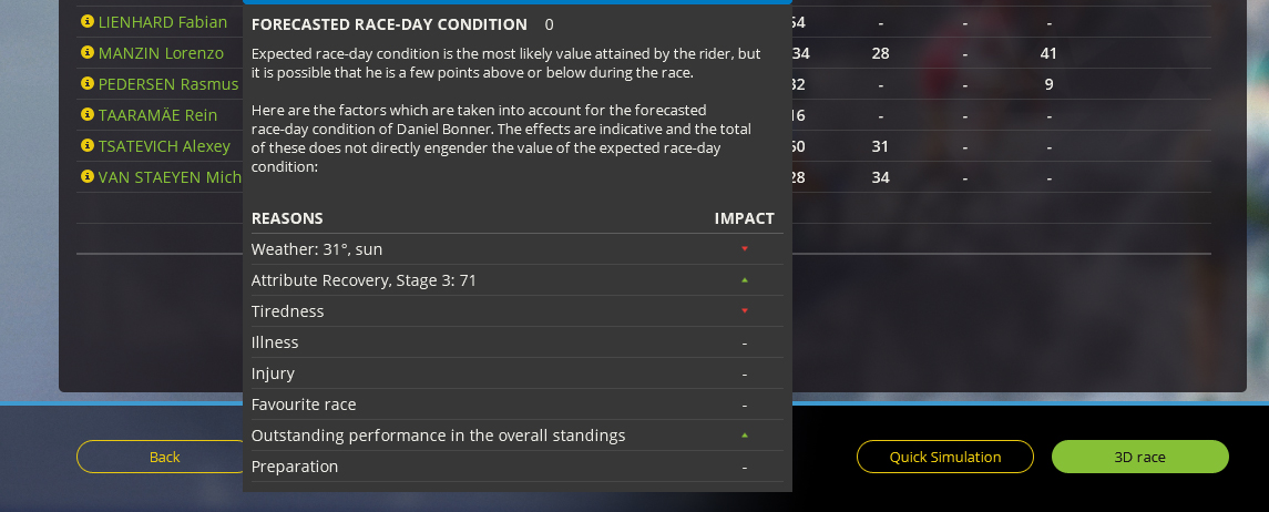I'm struggling with tiredness. After looking around, I think I've tweaked my training too much and not accounted for racing fatigue as well. Rolled over to a new season, so I tried a different approach this year. I currently have a tiredness in the 20s, freshness of 100. And yet, when I go into a new race, I hover my cursor over the predicted raceday condition to look at the things in favour or against me, and it's showing an arrow down for tiredness. This confuses me. Does anyone know what the threshold is for tiredness to be a negative impact on my raceday condition? I would think having a tiredness in the 20s and a freshness of 100 should (and 'break' training that week) shouldn't leave me with a negative impact for tiredness, but I'm hoping someone can enlighten me.