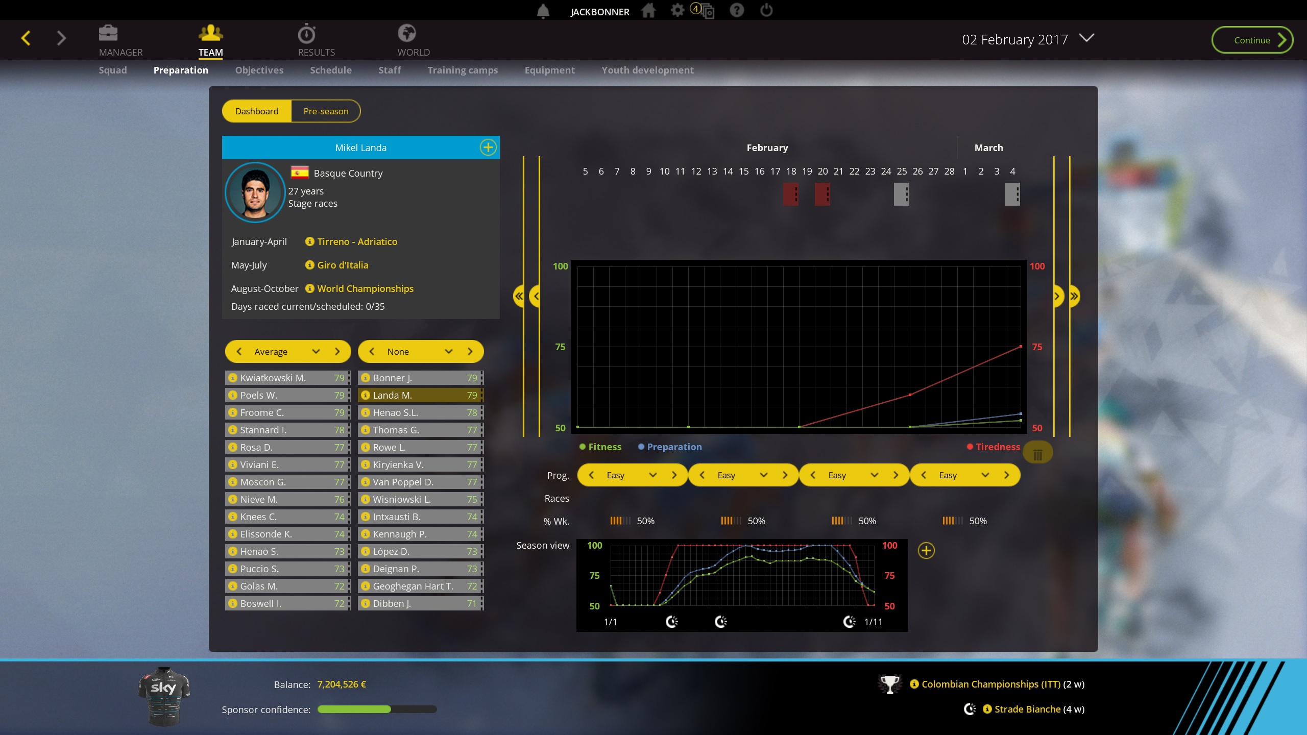 I feel like i've tried lots of different things but tiredness seems to get so high so quickly. I've attached a screenshot of a new save ive just started. Barely a month as passed in game, Landa is yet to participate in a race, has been on 'easy' preparation every month and as you can see fitness is going to hit 75% in a couple of weeks. The graph below on the image also shows it think it will hit 100% for most of the season.