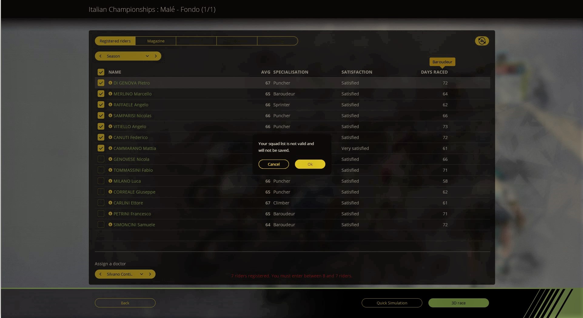 Hi guys, i need help cause i'm running out of ideas. Been playing first year of a career and it's all going smoothly till i get to the Italian National Championship where i can get to select my riders cause it keeps saying "Your squad list is not valid and will not be saved"