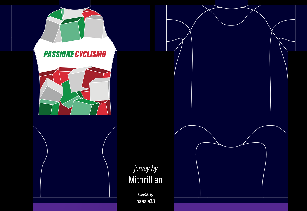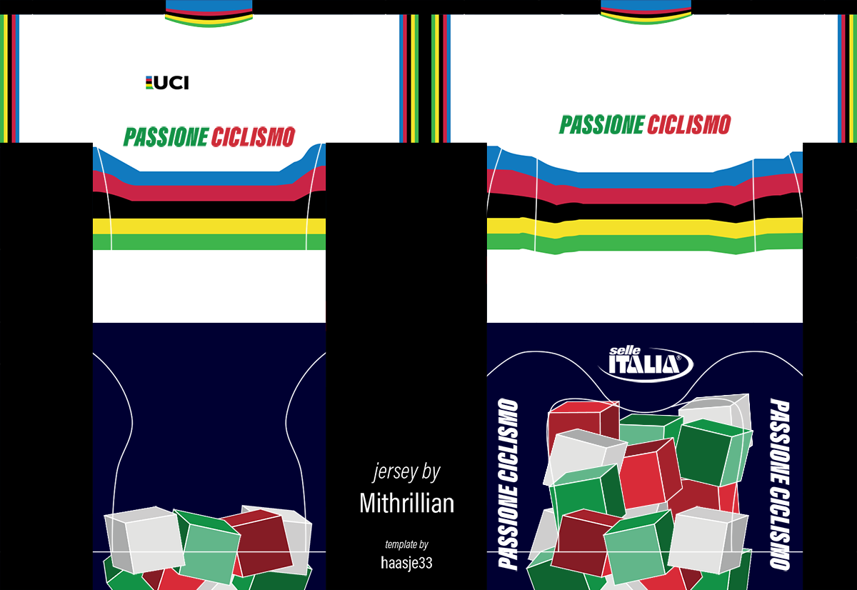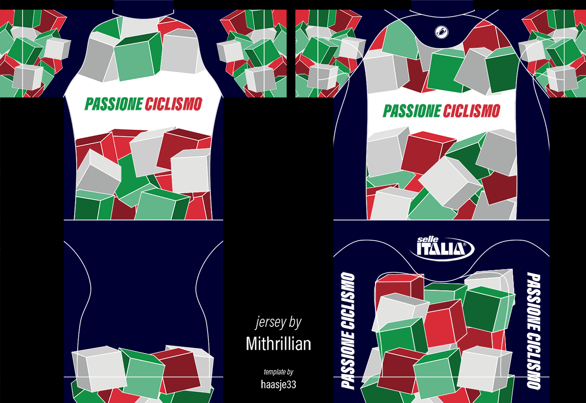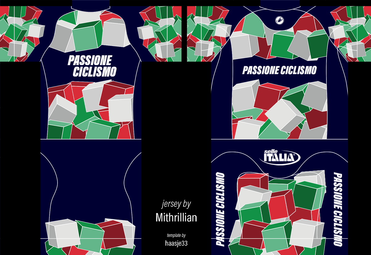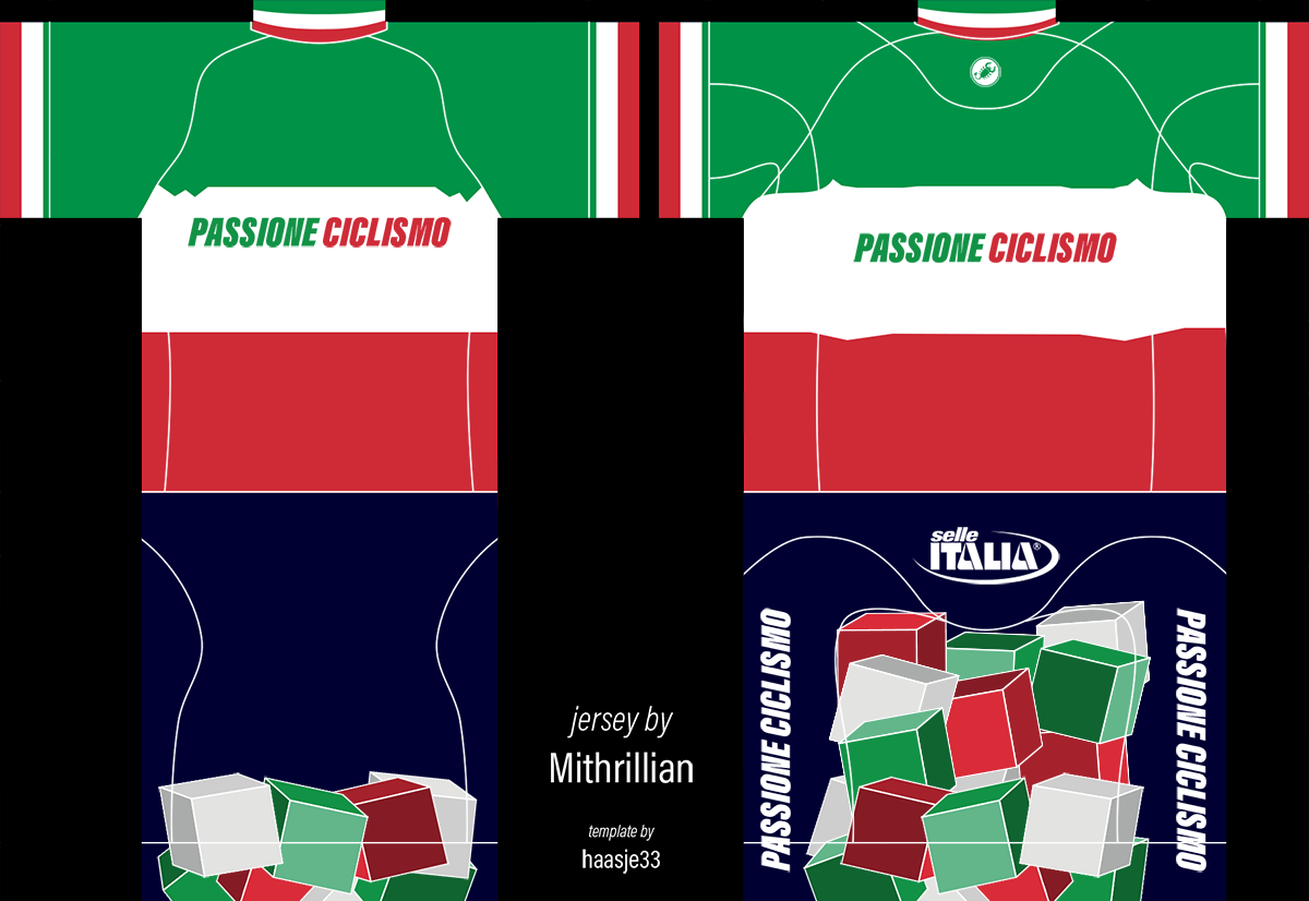 Yes, thanks. i need something like Mapei's Jerseys (https://cdn.shopify.com/s/files/1/138...1520436026) but with Green/White/Red colors, sponsor "Passione Ciclismo", and if you need some secondary sponsors else just something italian...like Pinarello, Colnago, Selle Italia, Campagnolo...as you want.