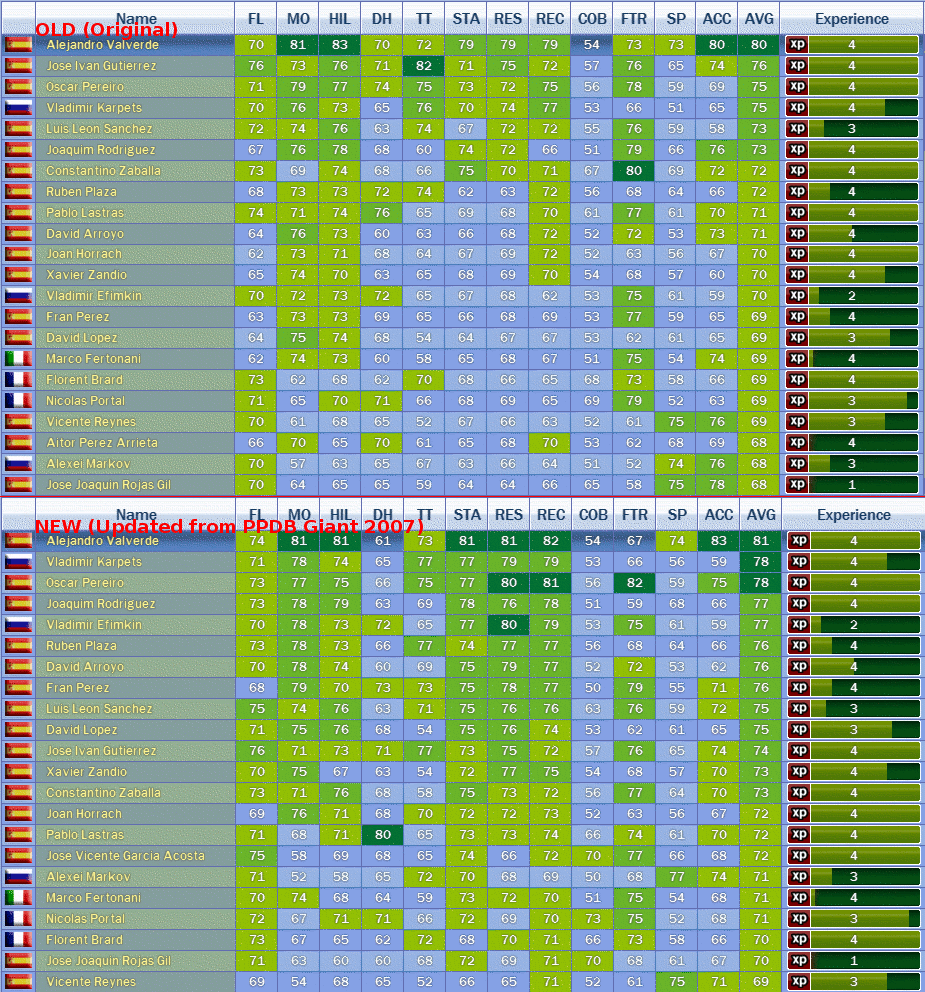 I have crosschecked rider-stats from the PPDB Giant07 (PCM06) with the Initial Mod (PCM07)